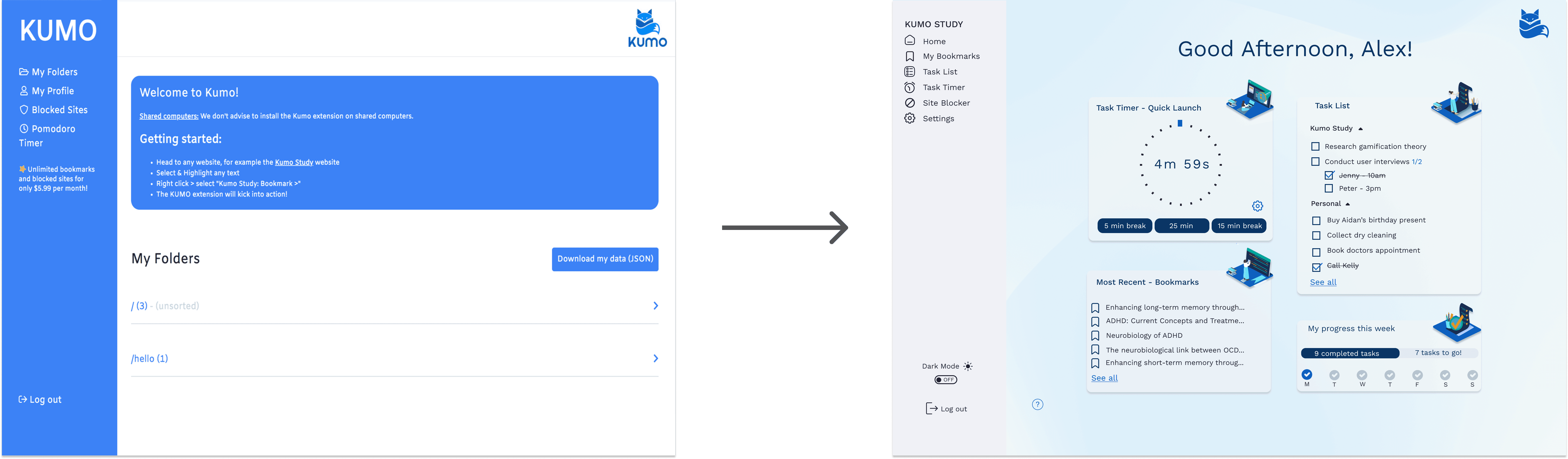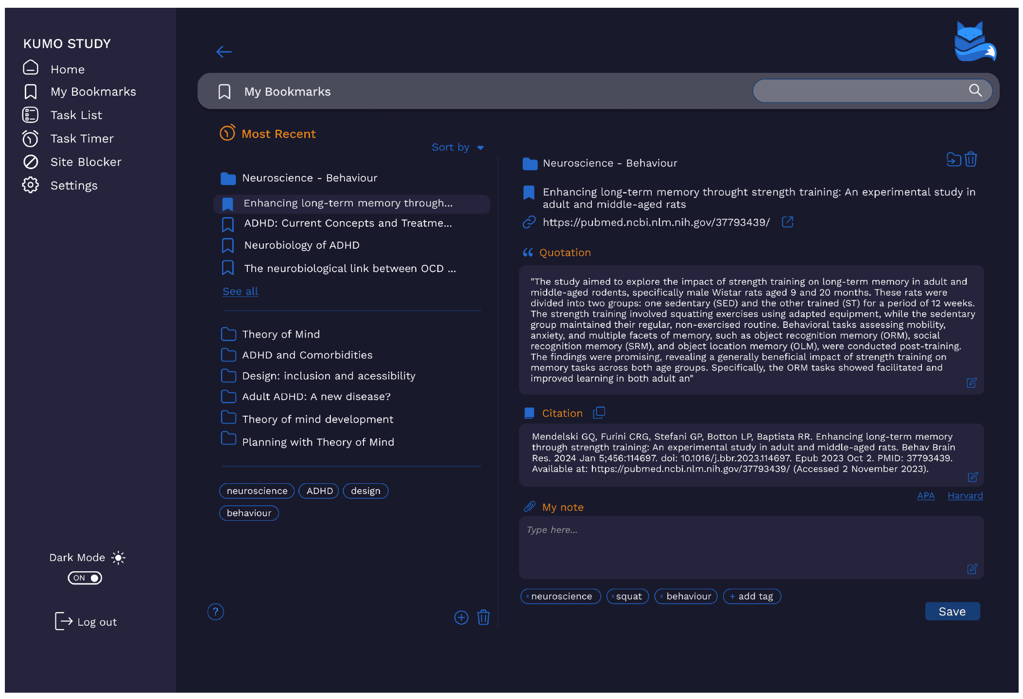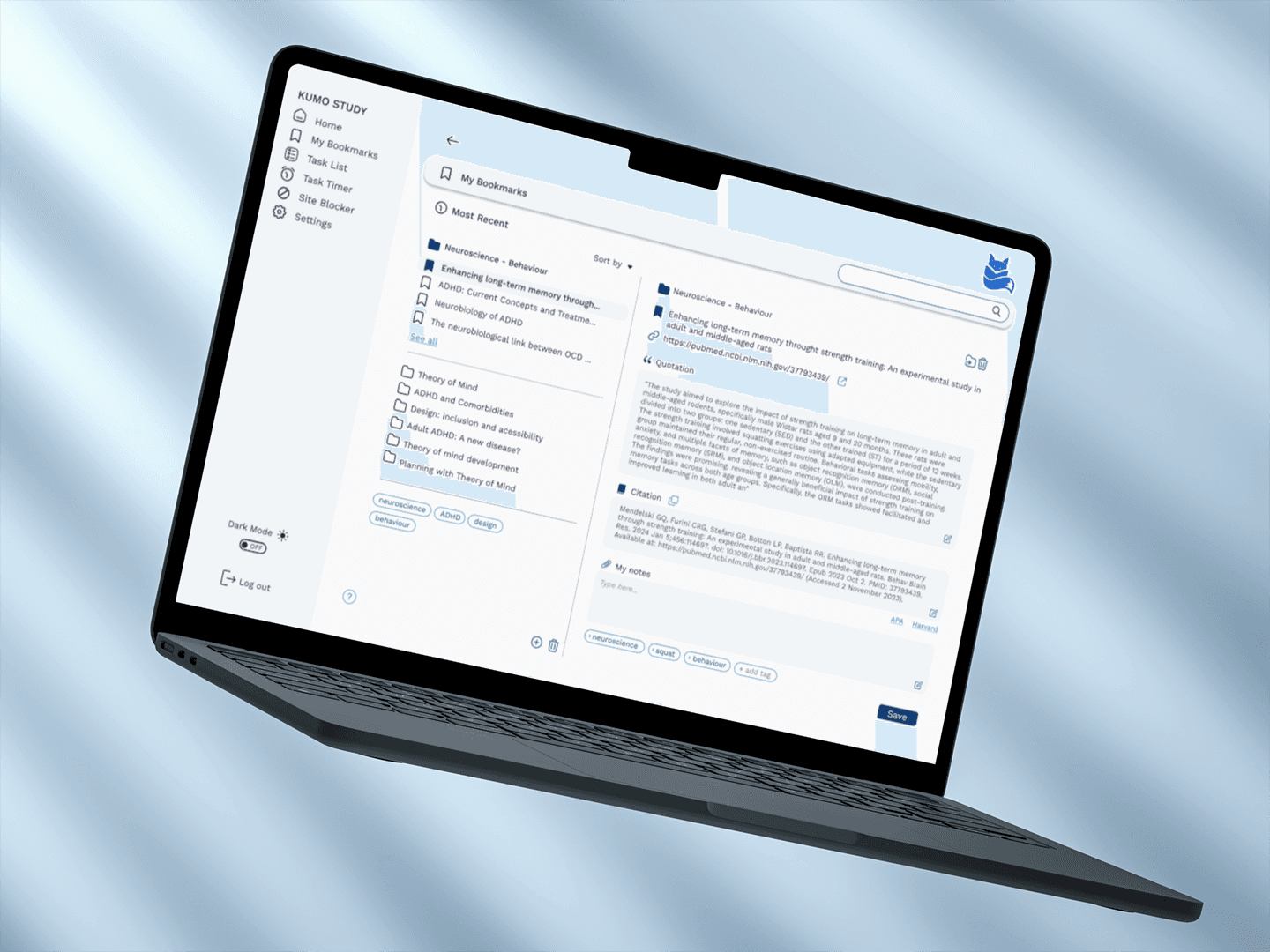 Launched in October 2023, Kumo Study is dedicated to helping students streamline their process when writing essays and preparing for their next exam. Kumo Study has set itself apart from other single function study tools, by providing an all-in-one alternative specifically marketed to students with ADHD. The plugin currently allows students to save bookmarks and web citations, block distracting websites, set a pomodoro timer, and create task lists.