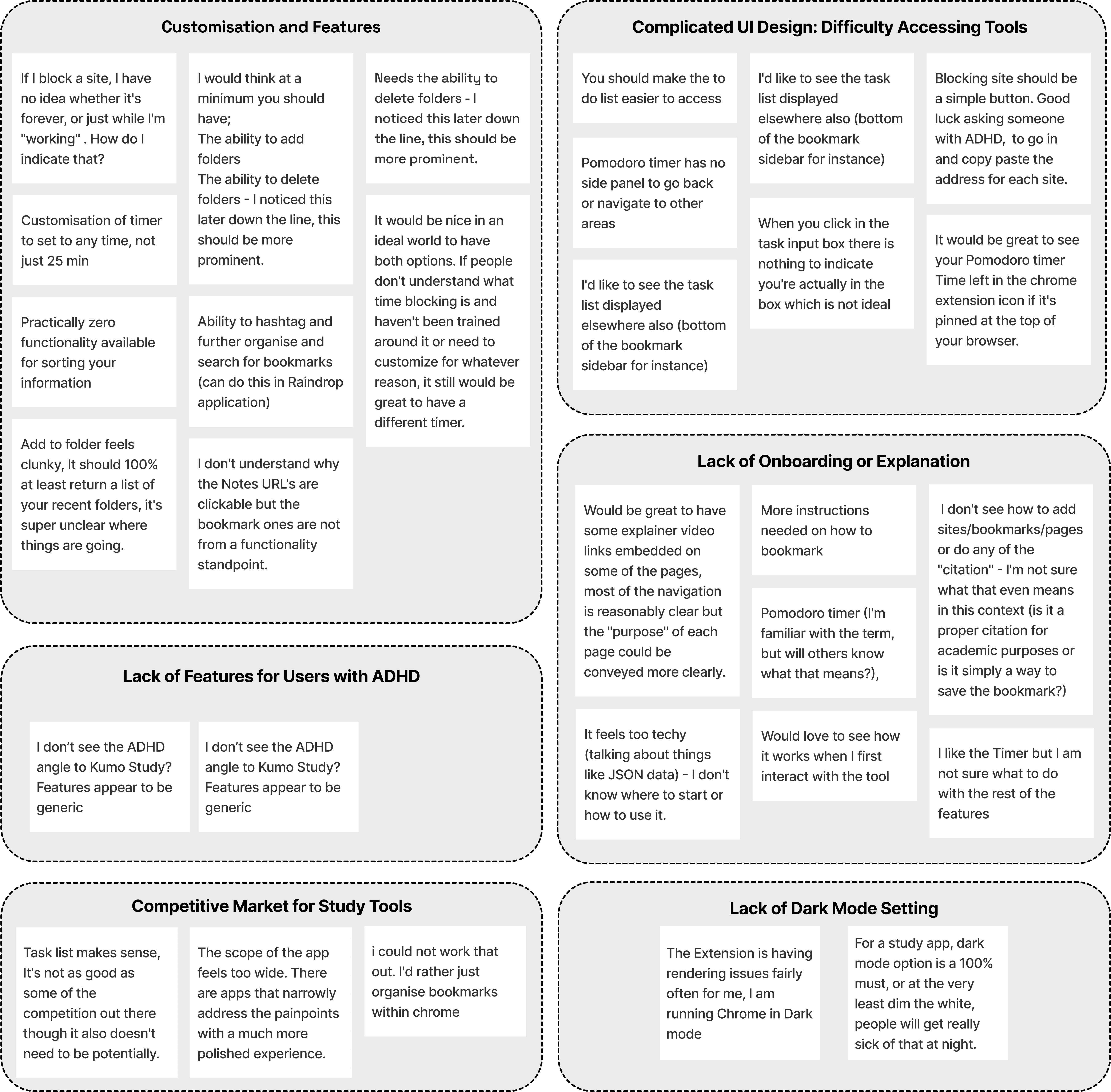 To analyse and interpret the extensive data we collected from the survey and usability tests, we used affinity mapping. This allowed us to comprehensively organise and understand the diverse range of feedback and insights gathered visually. We started to see some trends in the feedback and deduced several pain points: