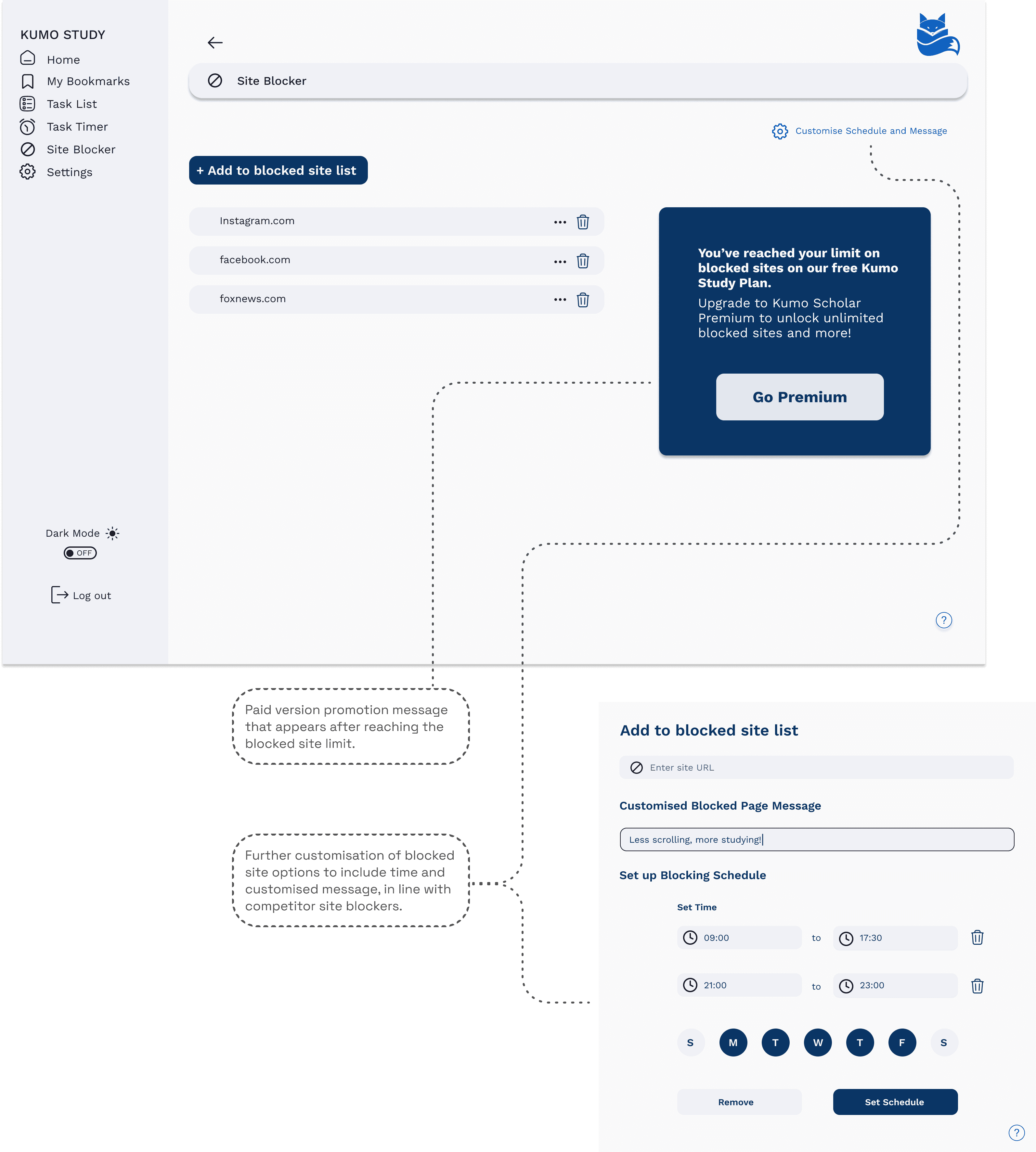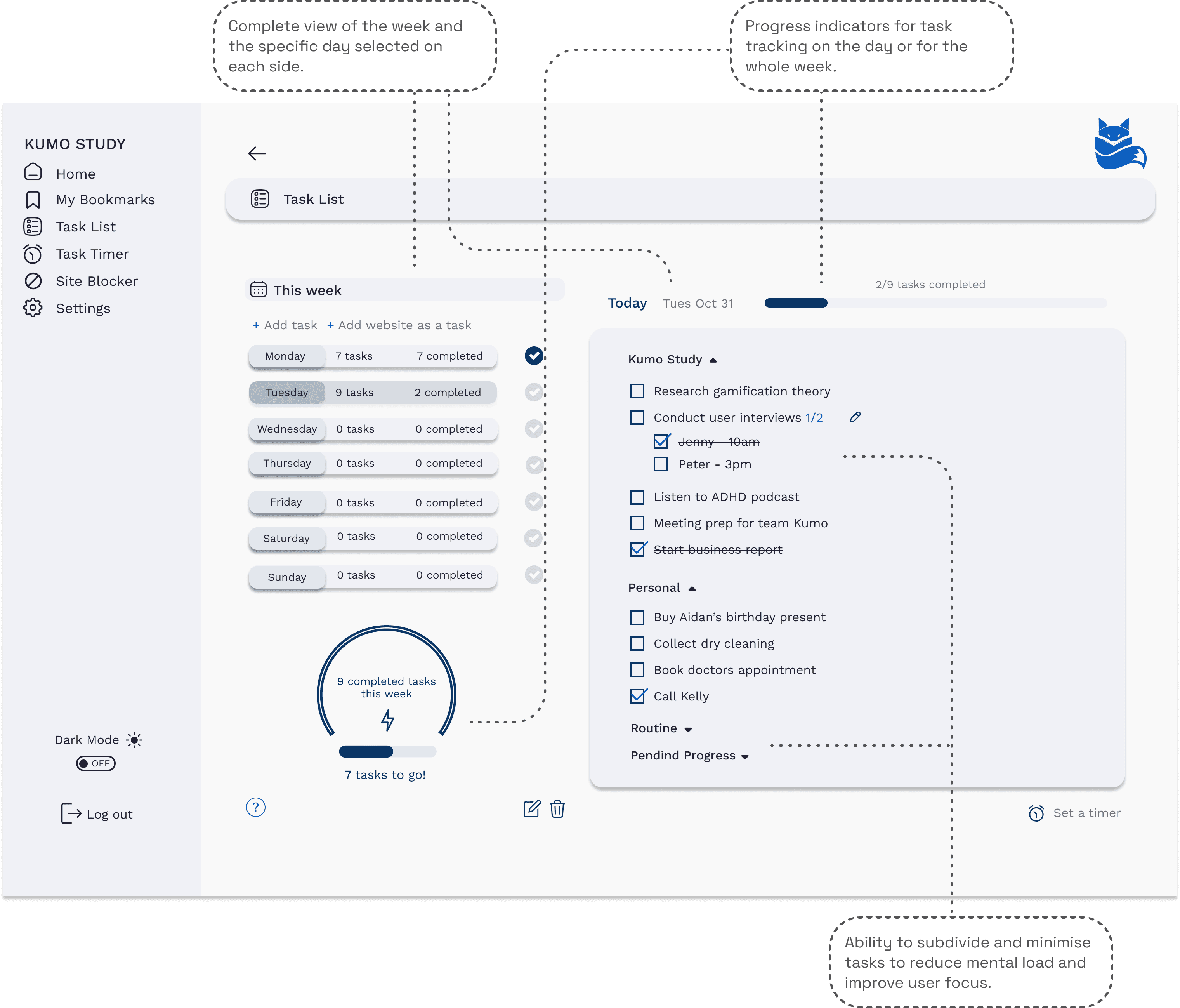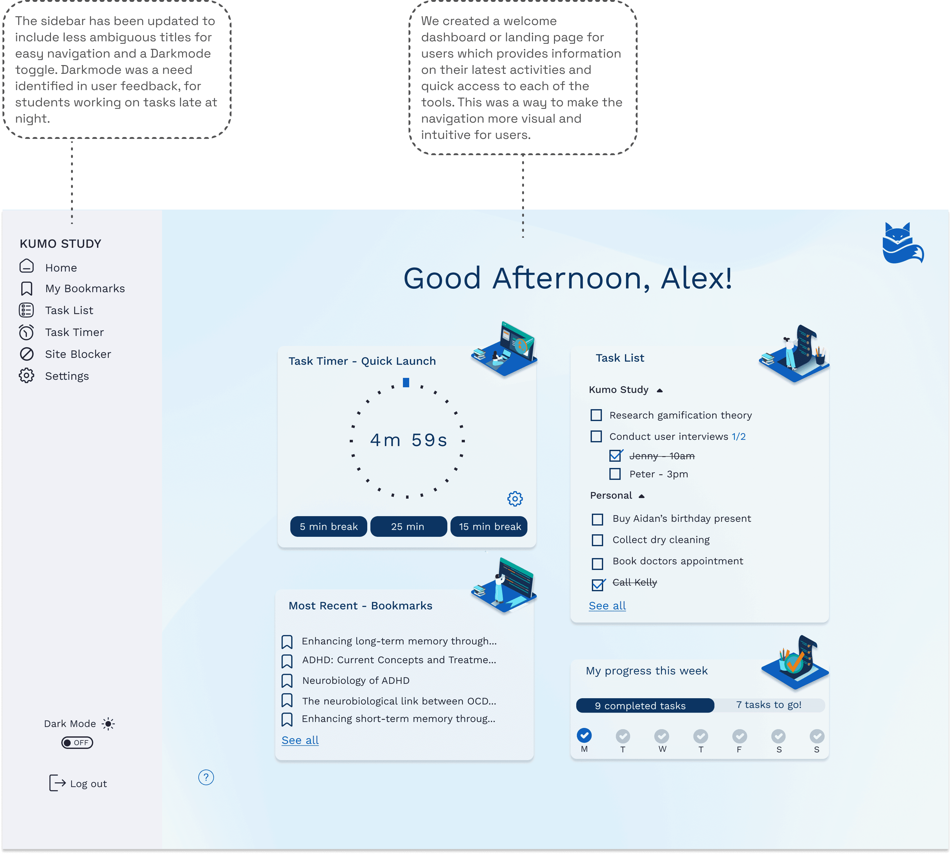 Since the pandemic and the switch to remote learning, tertiary dropout rates for students with ADHD have increased dramatically. We learned that Kumo's primary mission is to lessen the academic burden on these students. Totally inspired by Kumo's mission, we read extensively about designing for people with ADHD, and decided to utilise recommendations from Lorna Mcknight's (2010) 'Designing for ADHD'. McKnight's guidelines (listed below) became a mantra guiding our process. However, we also recognised that these guides align with minimalist design principles and that many people struggle to focus while studying, not strictly those diagnosed with ADHD. Universal design, where products are created to be accessible and usable by as many people as possible, without the need for adaptation, became key. We agreed that approaching design problems with this mindset would also help Kumo reach a wider audience and benefit as many people as possible.