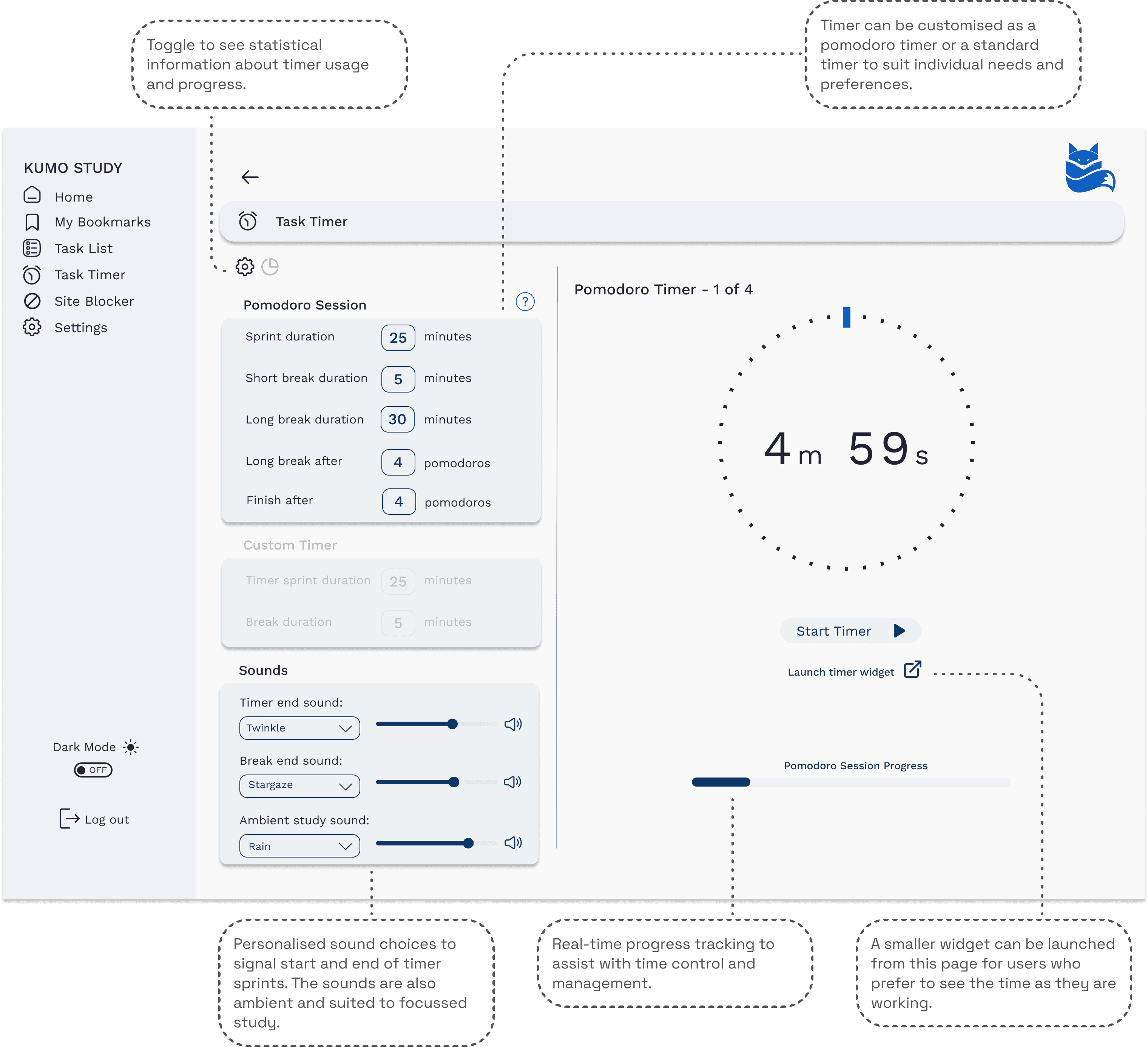 To facilitate swift access and enable students to time their tasks as they work, we crafted a widget and established multiple access points for each of the tools. This gives Kumo more versatility, in line with some of the other tools on the market.