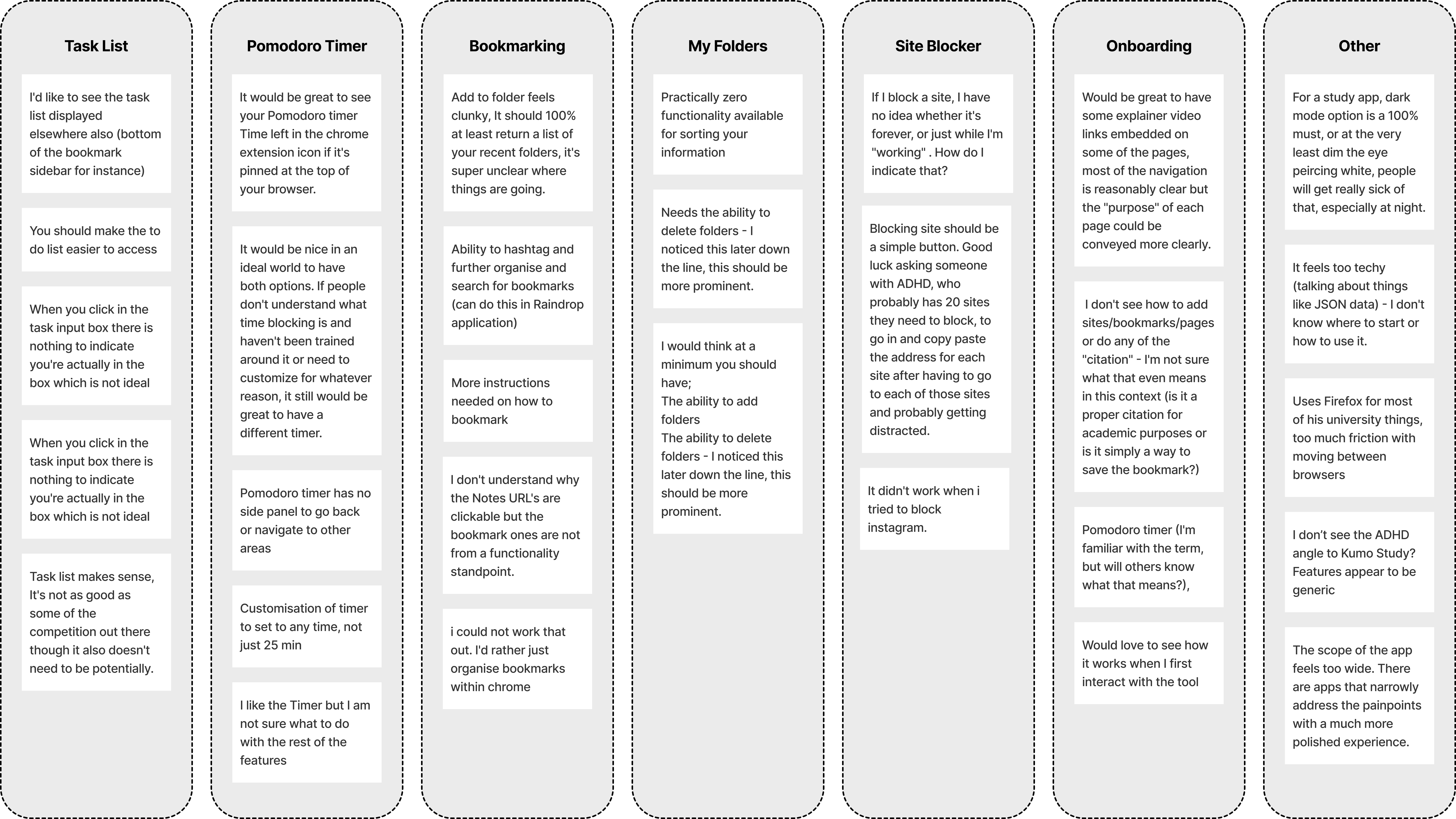 In our initial meeting we learned about Kumo's unique selling points and summarised them (right). We then supplemented existing user feedback with a new survey and usability tests targeting a range of users, including those with ADHD. The survey utilised open-ended and scaled questions, while the usability test could be completed remotely and covered each of the plugin’s tools. This provided us with both qualitative and quantitative data to unpack.