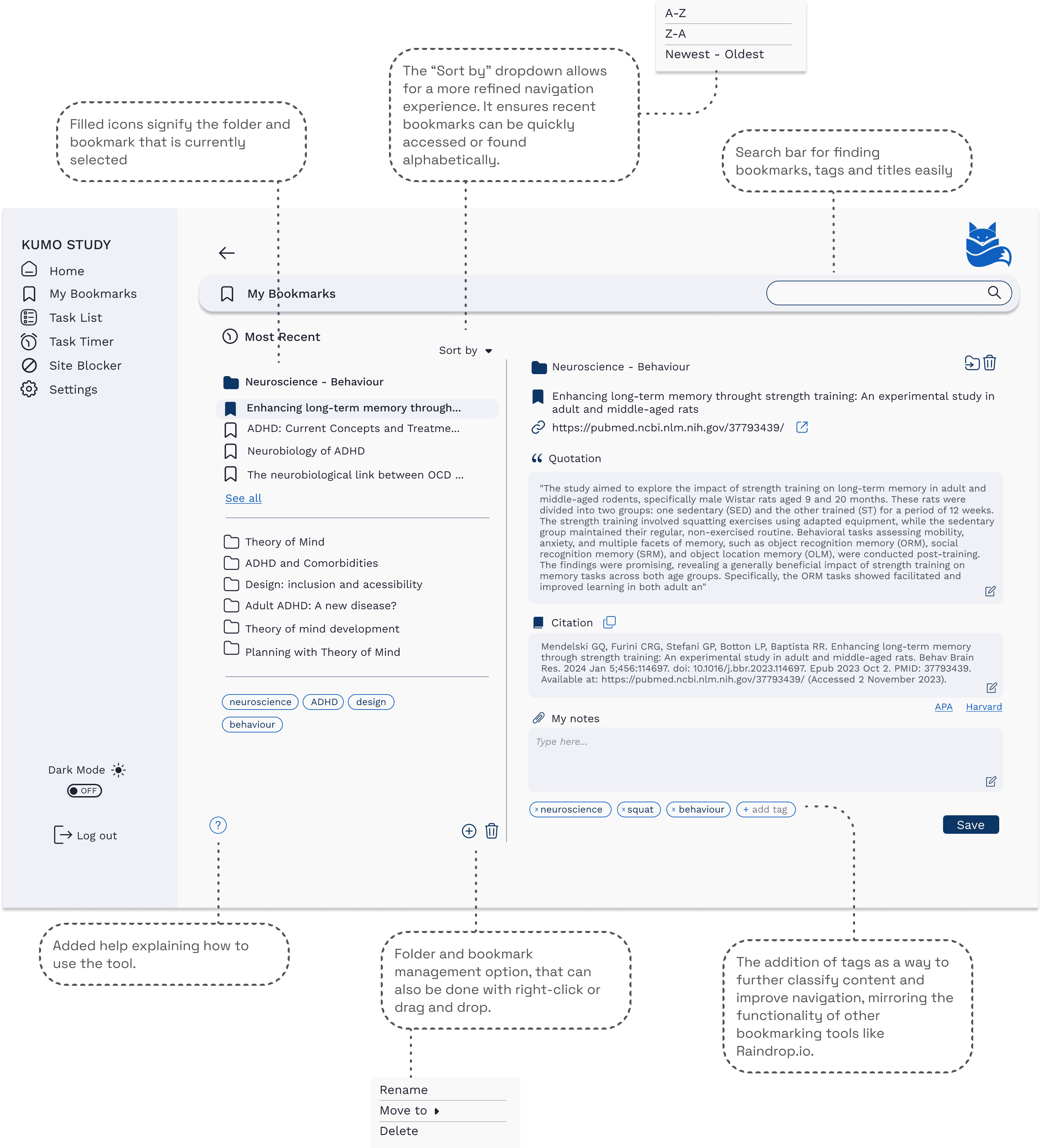 For each tool we utilised a two column layout, to make the content more easily digestible for users. We provided support icons and messaging as a means to explain how the tools function. We also added numerous new features such as tagging, to ensure the product is competitive. The annotations below detail the changes made to the bookmarking tool.